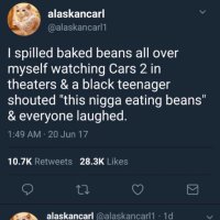 Alaskancarl2 On X I Spilled Baked Beans All Over Myself Watching Cars 2 In Theaters A Black Teenager Shouted This Nigga Eating Beans Everyone Laughed X